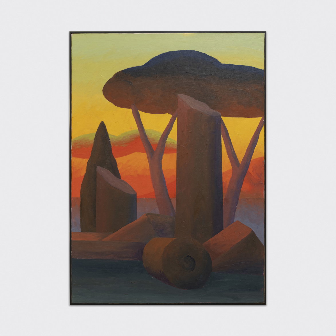 In the summer of 1984, Maurizio Calvesi invited Salvo to “Arte allo specchio” at the 41st Venice Biennale: he showed six works, including San Martino e il povero, Il bar, made in 1981, and a painting from the cycle Rovine dated to 1984. Upon returning from a long trip to Greece, Yugoslavia, and Turkey, he painted the mishram, typical Muslim graves he visited in Sarajevo. This theme, introduced by Franco Toselli, will be followed by Ottomanie (a neologism coined by Salvo), variants of the previous landscapes that feature minarets, which are portrayed to reveal the essentiality of their architecture.