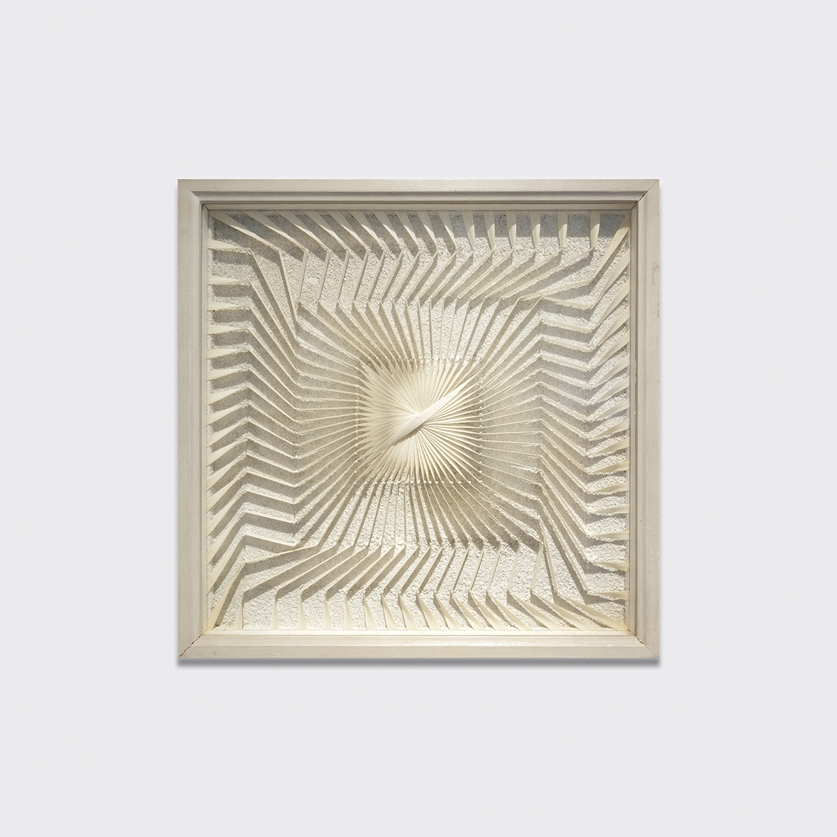 During this period, especially between 1959 and 1960, Biasi created the Trame, rectangular and permeable objects, where modularity has optical-kinetic implications in relationship between light and the shifting of a person’s gaze. Shortly after the realization of the Trame series came another important work: namely, Rilievi ottico-dinamici, overlapping lamellar structures in contrasting colors that spark special visual effects. Always during the 1960s, he produced the Torsioni series with the use of mostly bicolor lamelle, used to generate optical dynamism through different observer viewpoints, and his Ambienti pieces. He also realized Light prisms, which he designed in 1962 and were transferred to environmental dimensions in 1969.